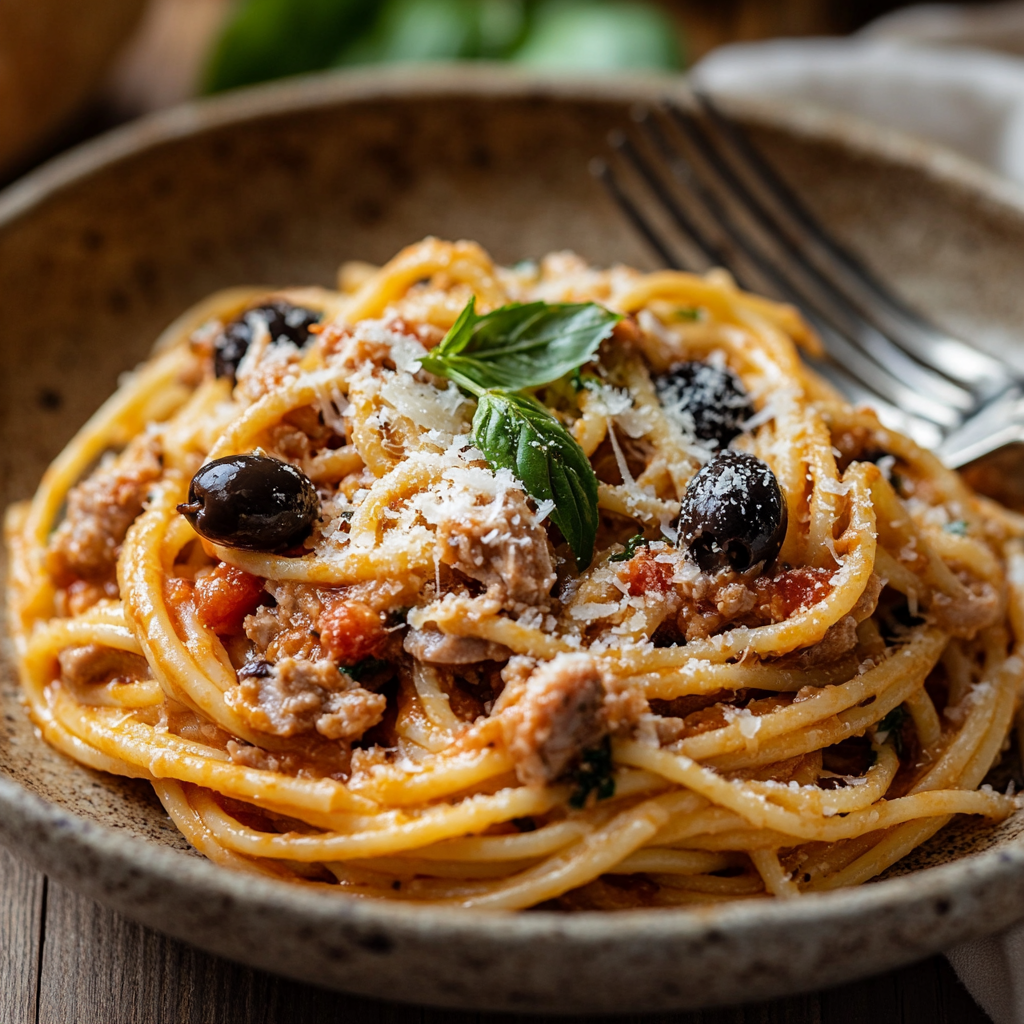 Un grand classique qui me sauve souvent les soirs de manque d’inspiration. Les pâtes sont enrobées d’une sauce tomate relevée, le thon apporte une belle texture et les olives ajoutent une touche méditerranéenne. Facile, rapide et toujours délicieux.